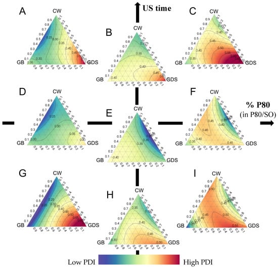 Ternary plot representations of the polydispersity index as a function of the percentage of polysorbate 80 (in P80/SO): ultrasound time (min). (A) 0:10; (B) 50:10; (C) 100:10; (D) 0:5; (E) 50:5; (F) 100:5; (G) 0:1 (H) 50:1; (I) 100:1.