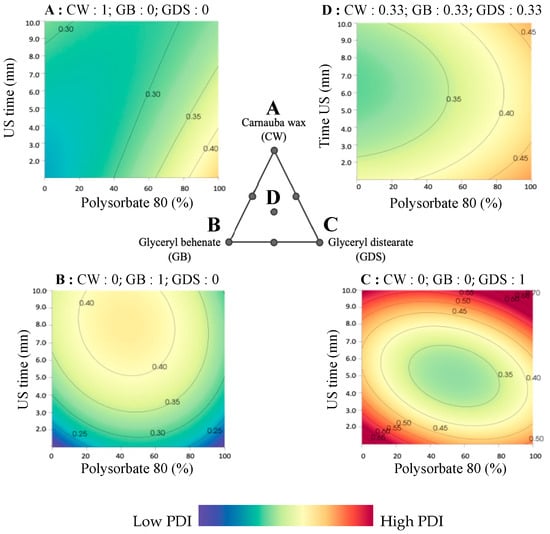 Surface plot representations of the polydispersity index as a function of the percentage of polysorbate 80 (in P80/SO) and ultrasound time in four places of the ternary diagram. (A) with carnauba wax (CW) as the sole lipid (proportion = 1); (B) with glyceryl behenate (GB) as the sole lipid (proportion = 1); (C) with glyceryl distearate (GDS) as the sole lipid (proportion = 1); (D) with an equal mixture of CW, GB, and GDS (proportion = 0.33 each).