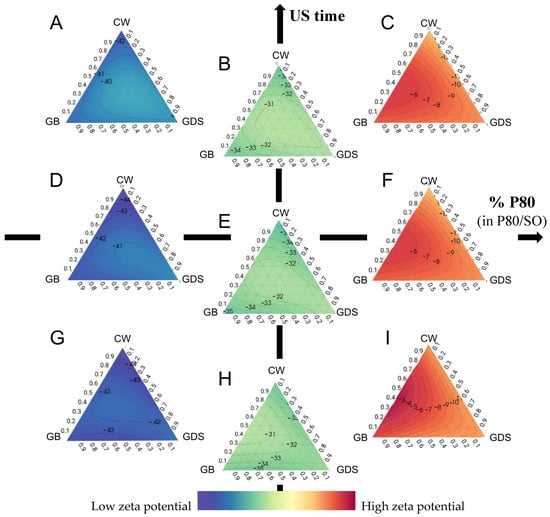 Ternaries plot representations of the zeta potential as a function of the percentage of polysorbate 80 (in P80/SO): ultrasound time (min). (A) 0:10; (B) 50:10; (C) 100:10; (D) 0:5; (E) 50:5; (F) 100:5; (G) 0:1 (H) 50:1; (I) 100:1.