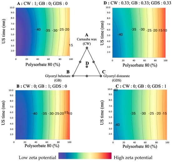 Surface plot representations of the zeta potential as a function of the percentage of polysorbate 80 and ultrasound time in four places of the ternary diagram. (A) with carnauba wax (CW) as the sole lipid (proportion = 1); (B) with glyceryl behenate (GB) as the sole lipid (proportion = 1); (C) with glyceryl distearate (GDS) as the sole lipid (proportion = 1); (D) with an equal mixture of CW, GB, and GDS (proportion = 0.33 each).