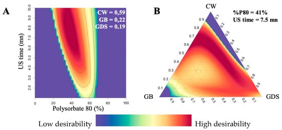 In our case, the global desirability is represented by Figure 9. With the surface plot representation (Figure 9A), we noticed that the percentage of P80 needs to be between 35–45%, and the US time higher than 6 min to obtain a high desirability (area in red). With these parameters, the range of the lipids should be: 0.25 to 0.7 for CW, 0.1 to 0.4 for GB, and 0 to 0.6 for GDS (Figure 9B).
