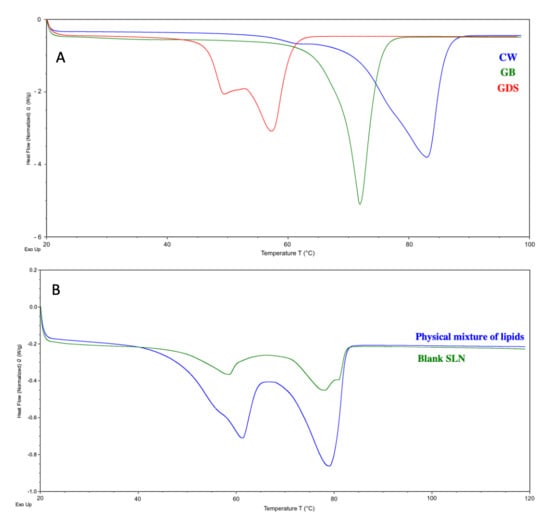 DSC thermograms of (A) the raw materials, CW (blue), GB (green), and GDS (red), and (B) the physical mixture of lipids (blue) and the blank SLN (green).