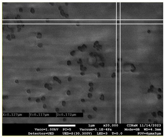 The morphology of the nanoparticles was evaluated using the scanning electron mi- croscopy (SEM) technique. A JEOL JSM-7900F microscope (Tokyo, Japan) was used. Briefly, a small amount of diluted blank SLN was placed on a silicium wafer support attached to a stub and placed under vacuum for several minutes to dry the sample using a turbomolecular pump. SEM was operated in standard mode (SEM) at 5 kV (WD = 11 mm using chamber secondary electron detector) and using 2 kV decelerating GB (gentle beam) mode for a final accelerating voltage of 1 kV (WD = 4 mm using an Everhart-Thornlet secondary electron detector), which is a specific mode to analyze isolated materials without carbon deposition. All analyses were performed at room temperature (20 °C). Digital images were acquired using already owned JEOL SEM-PC software (version 3.0).