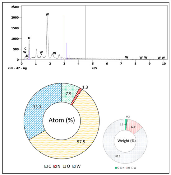 The synthesized WO3 NPs were also investigated through elemental and morphological analysis using microscopic techniques. The SEM, elemental mapping, EDX, and TEM results are shown in Figure 2, Figure 3, Figure 4 and Figure 5. The SEM image (Figure 2) represents the particle in a semi-speckled manner and as being rough. The EDS elemental mapping shows a uniform distribution of C, N, W, and O particles in the WO3 crystal, as shown in Figure 3a–d. The EDS spectrum of WO3 (Figure 4) reveals the peaks of 33.3% of tungsten (W), 57.5% of oxygen (O), 7.9% of carbon (C), and 1.3% of nitrogen (N). The observed peaks corresponding to W and O were attributed to the WO3 metal oxide, whereas signals C and N originated from the phytochemicals present in the PE.