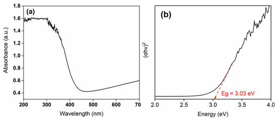 The optical properties of the synthesized WO3 photocatalyst were investigated through UV–Vis spectroscopy, and its band gap energy was subsequently determined (Figure 7a,b). As shown in Figure 7a, WO3 exhibits a distinct absorption edge around 400 nm, which is consistent with the UV–Vis spectra of WO3 reported in the previous literature [60,61,62].