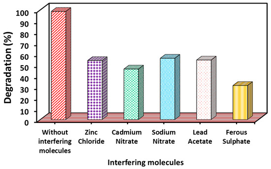 Interfering ions have a significant impact on dye degradation, which varies to a large extent. This is mainly because interfering ions (cations and anions) can act as scavengers for reactive free radicals, electrons, and holes that participate in the degradation process. Scavenging the reactive species ultimately prevents the degradation of dyes [66,67]. In addition, these interfering ions can also act as competitive ions that compete with the dye for adsorption on the photocatalyst surface. This competition leads to a decrease in the degradation activity. Therefore, for the present study, the MB dye degradation rate was also investigated under the same conditions in the presence of several interfering molecules (with the concentration of each interfering molecule being 10 mg/L) such as ZnCl2, Cd(NO3)2, NaNO2, Pd(CH3COO)2, and FeSO4. It was found that all these ions significantly reduced the rate of MB degradation (Figure 10).