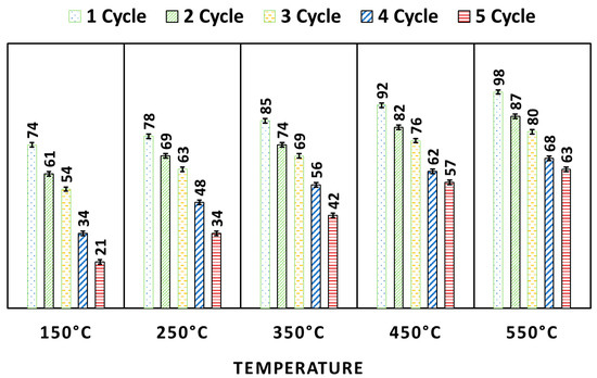 On using regenerated WO3, it is found that as the temperature of heating increases (150 to 550 °C), its degradation efficiency also increases (Figure 11). This is because the high temperature is very efficient for the pyrolysis of MB, adsorbs on the surface of WO3, and increases the free surface sites, and it is ultimately efficient for the higher degradation efficiency of WO3. All five pyrolyzed photocatalysts were used for several cycles. The photocatalysts heated at all five temperatures showed good reusability. The pyrolyzed WO3 (at 550 °C) showed 63% MB degradation after the fifth cycle. This result suggested the high stability of the WO3 NP.