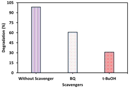 Free radical scavenging is an important step to understand the mechanism of photodegradation of any organic molecule on the photocatalyst surface. This experiment determines the free radical neutralization activity of a compound that acts as a trapping agent (or scavenger) for free radicals like hydroxide (•OH) and superoxide (•O2−) ones. Depending on the free radical scavenging activity, this experiment reveals which radical plays a key role in photodegradation. The free radical scavenging test was conducted using 0.25 mM of tert-butyl alcohol (t-BuOH: hydroxide free radical; •OH) and p-benzoquinone (BQ: superoxide free radical; •O2−) [57].