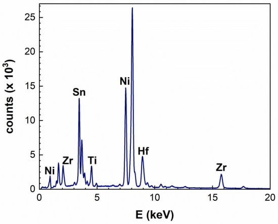 In addition, EDS spectroscopy confirmed the aforementioned findings. In Figure 3, a typical EDS spectrum is illustrated, originating from a larger particle in the sample. The peaks of the main HH elements (Ti, Zr, Hf, Ni, Sn) are easily distinguished, whereas Sb was difficult to detect, both due to its low content and also to the overlapping with the Sn L family lines; therefore, the sum of these two elements will be considered in any quantitative calculations from now on. Quantitative analysis of the EDS spectra from all regions in the TEM sample has been performed, and the results are listed in Table 2. Therefore, it is confirmed that, in general, the elemental ratios are in good agreement with their theoretical values in the vast majority of the particles analysed. Zr and Hf showed some elemental fluctuations, with an opposite trend, which implies elemental inhomogeneities at the nanometer/atomic scales. This is also further confirmed by the fact that Hf-rich or Sn-rich particles have been detected by EDS; nevertheless, such particles constitute a rather small portion compared to the roughly stoichiometric ones. As SAD, HRTEM, and EDS analyses resulted in slight variations in stoichiometry among different crystallites, the material has been further investigated using EXAFS spectroscopy in order to derive complementary detailed information on the material’s nanostructure. Indeed, the EXAFS technique probes a larger volume of the alloy and can consequently describe the average of the local environment of the host/dopant atom. Overall, however, no phase separation [19] has been detected by SAD and HRTEM measurements, while it was confirmed by EDS that the particles, large or small, comprise a ternary mixed Sb-doped (Zr,Hf,Ti)NiSn phase.