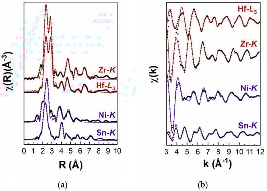 The EXAFS spectra of the studied HH compound were measured at the Ni-K, Sn-K, Zr-K, and Hf-L3 edges at the BM31 Swiss Norwegian beamline of the European Synchrotron Radiation Facility (ESRF). The beamline is equipped with a Si(111) double-crystal monochromator that covers a wide spectral range (4–90 keV). All spectra were recorded at room temperature in the transmission mode using a set of ionization chambers. The first detector is positioned in front of the sample and records the intensity of the impinging X-rays to the sample’s surface (I0); the second is placed after the sample in order to detect the transmitted beam. Data reduction involved the following processing steps: normalization of the raw data to the beam current I0, subtraction of the atomic background, and transformation from the energy- to the k-space [25]. Data analysis of the EXAFS data proceeded using proper photoelectron scattering paths built with the FEFF8 code [26], while the fitting was performed using FEEFIT [27].
