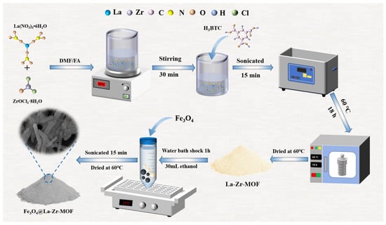 The preparation process of the Fe3O4@La-Zr-MOFs is shown in Figure 1. La(NO3)3·6H2O and ZrOCl2·8H2O were weighed into a beaker in a molar ratio of 1.25:1, supplemented with DMF/FA (31.5/31.5 mL), mixed and stirred for 30 min, supplemented with 0.2206 g of trimesic acid, ultrasonicated for 15 min, and then placed in a reactor at 60 °C for 18 h. The product was then centrifugally washed to neutrality with DMF and ethanol. The sample obtained after vacuum drying at 60 °C was the Zr-La-MOFs.