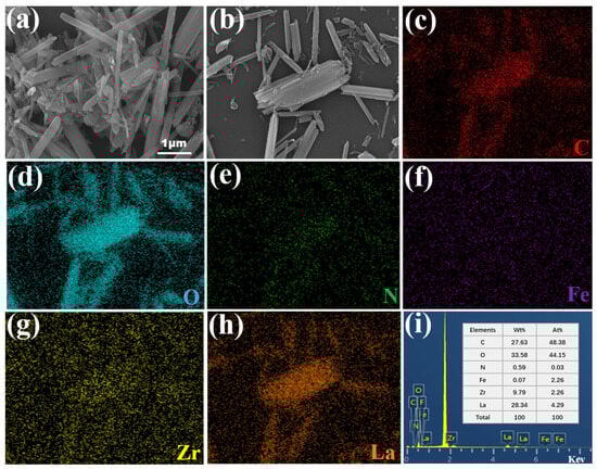 The topographic feature and surface elements of the Fe3O4@La-Zr-MOFs were analyzed employing SEM and EDS characterization. The findings are depicted in Figure 2a,b, demonstrating that the adsorbent possesses a unique rod-like structure, with irregular nanoparticles attached to the surface, and the size distribution varies between 0.1 and 50 μm. The rod-like structures usually have high aspect ratios; moreover, the attachment of irregular nanoparticles improves the density of active sites, increases the number of adsorption sites, and facilitates the interaction of pollutants with the surface of the material, thus improving the adsorption performance [28]. From the EDS analysis, as shown in Figure 2c–h, it can be seen that Fe3O4@La-Zr-MOFs consisted of the elements C, N, O, Fe, Zr, and La, and the mass percentages of Zr and La were 9.79% and 28.34%, respectively. The even dispersion of every element across the adsorbent surface facilitated the enhancement of phosphate and fluoride adsorption.