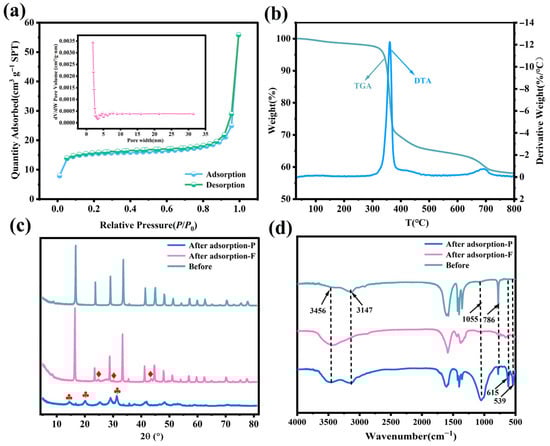 Figure 3c displays the XRD patterns of the Fe3O4@La-Zr-MOFs before and after adsorption. The obvious and sharp diffraction peaks that can be observed before the adsorption indicate that the material has a high degree of crystallinity. After fluoride removal, the main diffraction peaks did not shift or disappear, and the material’s crystal structure was not damaged, indicating good crystal stability. However, three new characteristic peaks appeared at 2θ = 24.83°, 29.91°, and 43.71°, indicating that ion exchange occurred between the adsorbent and fluoride ions, forming new crystals [33]. After the adsorption of phosphate, the crystal structure was disrupted, the intensity of the characteristic peaks was significantly reduced, some peaks were shifted, and new diffraction peaks appeared at 2θ = 14.47, 20.07° and 31.30°, demonstrating that interactions between the metal ions Zr and La and the phosphate occurred to form M-O-P inner-sphere complexes.