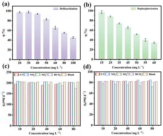 Effect of initial concentration on (a) fluoride removal and (b) phosphate removal; effect of co-existence on (c) fluoride removal and (d) phosphate removal.