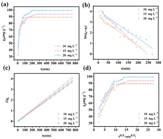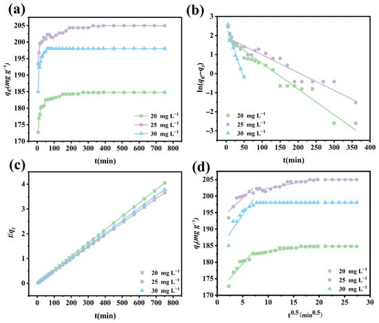 Adsorption kinetics experiments were carried out by altering the contact time to assess the reaction rate of the Fe3O4@La-Zr-MOFs for the adsorption of target anions. Figure 6a and Figure 7a show that the kinetic adsorption processes of the two pollutants are similar, with rapid adsorption within the first 60 min, a rapid increase with the increase in reaction time, and the adsorption equilibrium being reached after that point with the increasing saturation of the active sites on the material. The difference is that the adsorption time for fluoride ions is much shorter, with an adsorption equilibrium time of approximately 110 min. This is due to the relatively small size of fluoride, which requires a shorter distance to reach the adsorption sites on the Fe3O4@La-Zr-MOFs. Three adsorption kinetic models—pseudo-first-order, pseudo-second-order, and intra-particle diffusion were employed to fit and analyze the adsorption process, which are represented by Equations (S3)–(S5), respectively.