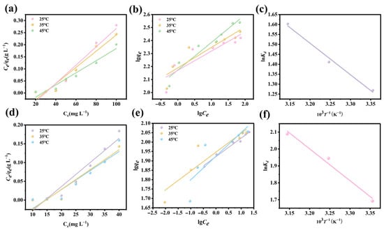Langmuir model for (a) fluoride and (d) phosphate; Freundlich model for (b) fluoride and (e) phosphate; linear relationship between ln Kd and 103T−1 for (c) fluoride and (f) phosphate.