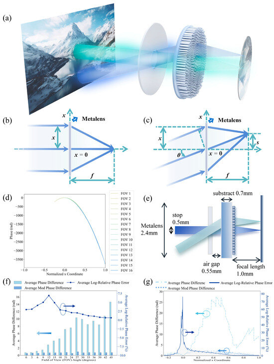 Metasurfaces have emerged as a compelling alternative, offering a new paradigm for planar optics. By engineering subwavelength nanostructures on a flat substrate, metasurfaces allow unprecedented control over the phase, amplitude, and polarization of light within an ultrathin profile [3,4,5,6,7,8,9]. This capability enables the functional compression of bulky optical systems and holds particular promise for imaging applications demanding compactness and precision. Building on these advances, metasurfaces have been extended to a wide range of practical implementations, such as planar lenses [10,11,12,13], holographic displays [14,15,16], vortex beam generators [17], and polarization modulators [18,19]. Specifically, various strategies have explored the potential of metasurfaces for wide-angle imaging, where angle-dependent off-axis aberrations pose a critical challenge. Early theoretical work analyzed aberrations under oblique incidence, leading to the design of an aplanatic metasurface on curved substrates for aberration correction [20]. While theoretically effective, curved configurations pose significant fabrication challenges and limit integrability. To address this, dual-layer planar metasurfaces inspired by compound lenses have been developed, demonstrating enhanced field-of-view (FOV) performance while simplifying fabrication [21,22]. Furthermore, subsequent developments replaced the first metasurface of the doublet with a small physical aperture to enhance off-axis performance while reducing structural complexity [23,24]. Concurrently, various optimization techniques have been applied on the computational design front, ranging from optimized sinusoidal phase profiles [25] to epsilon-greedy algorithms that tune the width and position of concentric nanorings in metalens [26]. More recently, fueled by advances in computational imaging and machine learning, researchers have explored wide-FOV image stitching from double polarization channels or multiple angular channels captured via metasurfaces [27,28]. Additionally, deep learning approaches have been applied to reconstruct images from optics for better wide-FOV performance [29,30], and even end-to-end joint optimization using neural networks for enhanced angular coverage has been pursued [31].