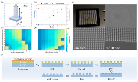 The metasurface was fabricated on a 4H-SiC substrate using standard semiconductor fabrication techniques. The detailed fabrication process flow [36], conceptually illustrated in Figure 2f, involved several key steps to transfer the designed pattern onto the SiC substrate. First, the SiC wafer was prepared by spin-coating an electron beam resist, followed by the deposition of a conductive layer to prevent detrimental charging effects. The high-resolution pattern of the metasurface was then defined using electron beam lithography (EBL), with potential double exposure employed to achieve precise pattern definition. After exposure, a suitable developer was used to selectively remove the unexposed resist. A brief pre-etch step was performed prior to metal deposition to ensure improved adhesion and quality of the subsequent mask layer. Next, a thin layer of Cr was deposited onto the sample via physical vapor deposition (PVD) to serve as a robust hard mask. A standard lift-off process was performed to remove the remaining resist and the overlying Cr, leaving the patterned Cr mask on the desired areas of the SiC surface. Finally, the defined Cr mask was used as a template to transfer the pattern into the SiC substrate using Reactive Ion Etching (RIE) to achieve the desired high aspect ratio and near-vertical sidewalls of the nanopillars. Figure 2e presents representative SEM images of the sample, including detailed top-down and 45° tilted views. These images visually confirm the excellent pattern fidelity, uniformity, and structural integrity of the fabricated SiC nanopillars across the metasurface.