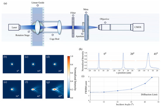 To experimentally verify the focusing capabilities of the fabricated metalens, an optical measurement setup was constructed as shown in Figure 4a. A collimated beam generated by a lens system was directed onto the metalens, which was mounted on a rotation stage to simulate different incident angles. A 20× microscope objective was used to better observe the focal spot captured by the CMOS.