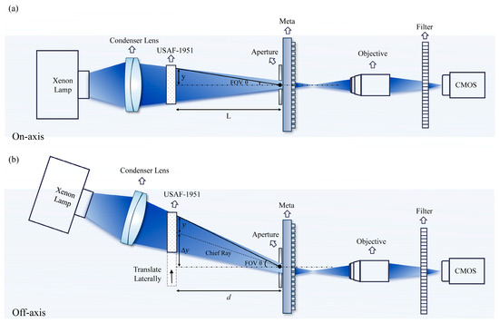 Imaging experimental setup. (a) A schematic of the imaging experimental setup on-axis, including a lamp, linear guide, color filter, metasurface, objective, and CMOS camera. (b) A schematic of the imaging experimental setup off-axis.