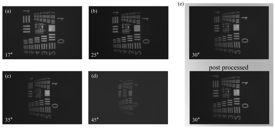 Imaging experiment results. (a–d) Experimental imaging results at various off-axis angles. (e) A comparison example of the actual captured image and the post-processed image at a 30° field-of-view.