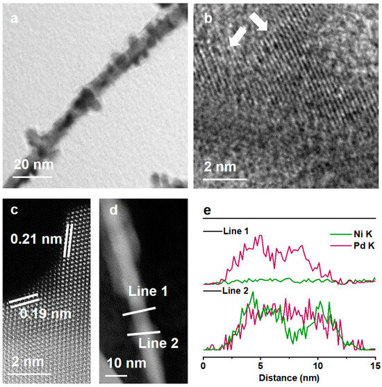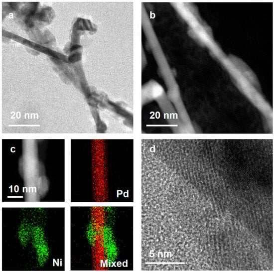 The Pd-Ni nanowires were prepared through the seeded growth on the pre-designed Pd nanowires [10,11]. Pd nanowires, as templates, were firstly synthesized based on previous research. As shown in Figure S1, uniform Pd nanowires were prepared with an average diameter of 6.2 nm. Pd-Ni nanowires were then constructed through the reduction and growth of the Ni species on the Pd surface. Figure 1a,b show the TEM and scanning TEM (STEM) images of Pd-Ni nanowires, respectively. Ni islands were partially coated on the Pd nanowires, which may originate from the large lattice mismatch between Pd and Ni elements. The huge strain between the Pd and Ni regulates the growth model, resulting in the anisotropic growth of bimetallic heterostructures [26]. To further affirm the elemental distributions of Pd and Ni, STEM energy-dispersive X-ray spectroscopy (EDS) was employed. As shown in Figure 1c, Ni elements were not uniformly distributed on the Pd nanowire. The atomic structure of bimetallic Pd-Ni nanowires was explored by the atomic-scale TEM (Figure 1d). The continuous lattice fringes from the Pd nanowire to the Ni islands indicate the epitaxial growth behavior. The lattice distance of the Ni (111) planes was calculated as 0.21 nm, which shows a 5% expansion compared to that of the standard Ni (111). The lattice expansion could be related to the larger lattice parameter of the Pd seed. The atomic contents were measured by the EDS (Figure S2), showing an atomic ratio of Pd39.8Ni60.2.