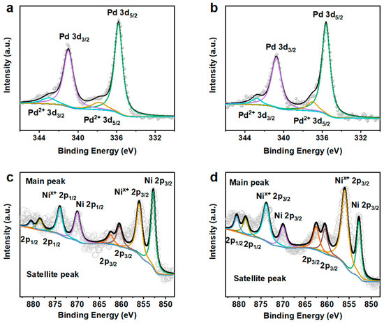 X-ray photoelectron spectroscopy (XPS) was used to analyze the electronic structures of Pd and Ni in the Pd-Ni and Pd-NiPd nanowires. Figure 3a,b show the high-resolution Pd 3d spectrum, affirming that Pd was significant in the metallic state in two samples. Minor Pd 2+ peaks were also detected, which may correlate with the slight surface oxidation or electron transfer interaction [20]. Importantly, compared with those of Pd-Ni nanowires (Figure 3a), the binding energy of Pd 3d5/2 in Pd-NiPd nanowires exhibits a negative shift (~0.2 eV). The reduced binding energy could originate from the strained Pd branches [19], which was consistent with the TEM results. Figure 3c,d show the high-resolution Ni 2p spectrum in Pd-Ni and Pd-NiPd nanowires, respectively. The Ni 2p spectrum demonstrates main peaks and satellite peaks. Inevitable oxidation peaks were revealed, which is attributed to the reactivity of Ni on its exposure to air [27]. The atomic ratios of Pd and Ni on the Pd-Ni nanowires and Pd-NiPd nanowires were calculated as 32.1/67.9 and 43.2/56.8, respectively. These results are lower than those of the EDS results, which may be attributed to the Ni-riched surfaces.
