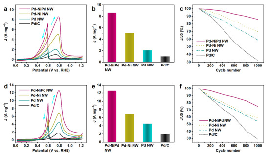 The prepared Pd-Ni and Pd-NiPd nanowires were tested as catalysts for electrochemical alcohol oxidation, including the EOR and EGOR. As a comparison, Pd nanowires and commercial Pd/C (10 wt.% loading) were also tested. Figure 4a shows the CV curves recorded in 1.0 M KOH containing 1.0 M ethanol. The Pd-NiPd nanowires demonstrated the highest current density from 0.4 V to 1.2 V (vs. the reversible hydrogen electrode, RHE). The arrow pointing to the positive direction represents the peak that sweeps from the lower to higher potential (vice versa). Pd nanowires and Pd-Ni nanowires also exhibit a superior mass current compared to commercial Pd/C catalysts. Their mass activities calculated at corresponding peak potentials were obtained (Figure 4b). Pd-NiPd nanowires exhibit the greatest current density of 8.63 A mgPd−1, which is 1.7, 4.2, and 8.5 times higher than those of the Pd-Ni nanowires, Pd nanowires, and commercial Pd/C, respectively. Apart from the oxidation activity, cycling stability stands out as another important factor in measuring the EOR performance. Figure 4c exhibits the cycling stability of Pd-NiPd nanowires, Pd-Ni nanowires, Pd nanowires, and Pd/C catalysts. In the initial 200 cycles, a slight decrease in mass activity was revealed on the Pd-NiPd nanowires. The current density was still maintained at over 85% after 1000 cycles. As a comparison, the cycling performances of Pd-Ni nanowires and Pd nanowires were less satisfactory. Only 30% of current density remained on the commercial Pd/C catalyst after 1000 cycles. These results suggest that Pd-NiPd nanowires exhibit an enhanced activity and stability toward EORs. The performance of the Pd-NiPd catalyst was better than many previously reported electrocatalysts for EORs (Table S1) [28]. In addition, Fourier transform infrared spectroscopy (FT-IR) was used to observe the reaction intermediates on the Pd-NiPd nanowires (Figure S6). A strong band at ~1645 cm−1 may originate from the adsorbed water, which prompts the formation of OH* [8,29]. Almost no CO peak located at ~2100 cm−1 was detected, indicating that CO* was effectively removed.