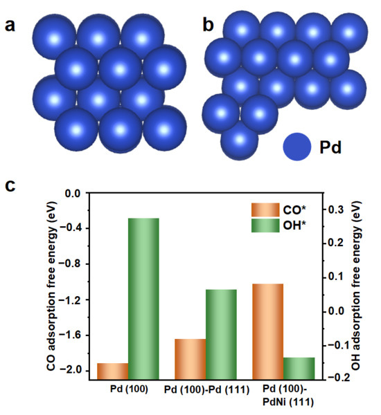 DFT calculations. (a,b) The atomic model of the Pd (100) surface and Pd (100)-Pd (111) interface. (c) Adsorption free energies of CO and OH on the active sites of the Pd (100), Pd (100)-Pd (111) interface, and Pd (100)-PdNi (111) interface.