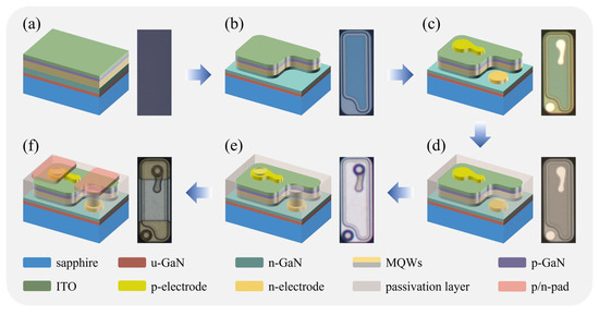 Fabrication steps of the GaN-based green flip-chip mini-LEDs with top-view micro-graphs of the mini-LEDs for each step: (a) epilayers of the green flip-chip mini-LEDs; (b) defining the mesa structure; (c) evaporation of the n-electrode and p-electrode; (d) deposition of the SiO2 passivation layer and evaporation of DBR; (e) formation of the n-electrode and p-electrode holes; (f) evaporation of the n-contact and p-contact pads.