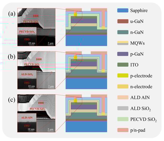 Schematics and cross-sectional TEM images of green flip-chip mini-LEDs with different passivation layers. (a) Sample A with single PECVD-SiO2 passivation layer; (b) sample B with a composite ALD-SiO2/PECVD-SiO2 passivation layer; (c) sample C with a composite ALD-AlN/PECVD-SiO2 passivation layer.