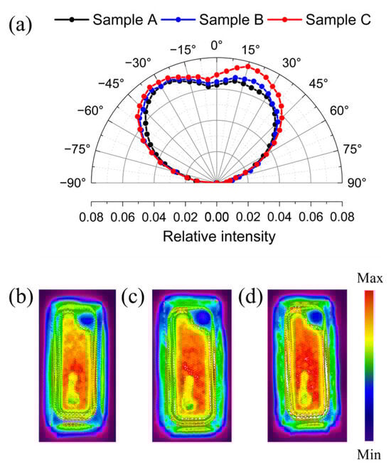 (a) Far-field emission pattern of sample A, sample B, and sample C at 5 mA. Near-field light-emitting intensity distributions of (b) sample A, (c) sample B, and (d) sample C at 5 mA.