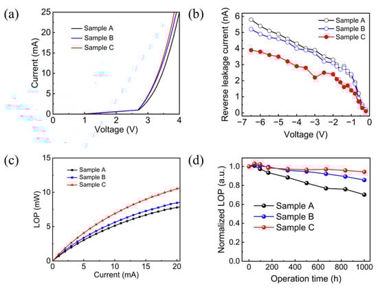 (a) I-V characteristics; (b) reverse I–V characteristics; (c) L–I characteristics, and (d) normalized LOP degradation after prolonged high-temperature and high-humidity aging test of sample A, sample B, and sample C.
