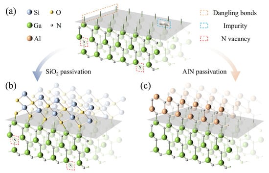To interpret the difference between the SiO2 and AlN passivation layers in reducing the surface state density, atomic structure models of the sidewall surface before and after passivation are shown in Figure 5. After ICP etching, the exposed GaN sidewalls generated a large number of dangling bonds, impurity contaminations, and lattice defects [28,29,30], as shown in Figure 5a. These plasma damages increased the density of surface states, leading to increased SRH recombination rates and severe leakage current [31]. In addition, hybrid density-functional theory (DFT) calculations have demonstrated that N vacancies are the main lattice defects on the sidewalls of GaN-based LEDs and act as a midgap position for the SRH recombination [32]. Using SiO2 for sidewall passivation can remove impurity contaminations and saturate partially dangling bonds. However, the lattice mismatch between SiO2 and GaN introduces internal stress, and the SiO2 passivation layer cannot effectively eliminate surface N vacancies, as shown in Figure 5a. Instead, using AlN for sidewall passivation may be an effective way of eliminating nitrogen vacancies by acting as a nitrogen source [33]. Meanwhile, a lattice-compatible AlN passivation layer can significantly reduce the number of dangling bonds, thereby reducing leakage current and enhancing the stability of green flip-chip mini-LEDs, as shown in Figure 5c.
