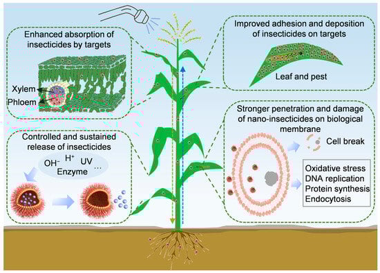Nano-insecticides exhibit a range of advantageous physicochemical properties, including nanoscale size effects, stimuli responsiveness, controlled release behavior, and enhanced interfacial activity [19,78]. These characteristics collectively contribute to their superior efficacy in controlling insect pests (Figure 1).