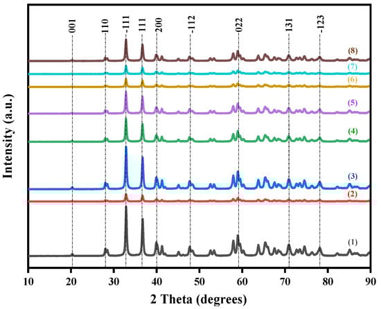 XRD pattern of (1) pristine ZrO2, (2) 3% Au/ZrO2, (3) Au2Co/ZrO2, (4) Au1.8Co1.2/ZrO2, (5) Au1.4Co1.6/ZrO2, (6) AuCo2/ZrO2, (7) Au0.5Co2.5/ZrO2, and (8) Au1.5Co1.5/ZrO2.