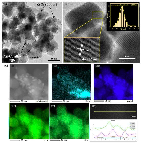 (A) A TEM image of Au2Co/ZrO2 catalyst. (B) An HR-TEM image of Au2Co/ZrO2 catalyst with the average particle diameter distribution curve of the ZrO2 support. (C) (I) A selected area of the Au-Co alloy sample; (II) an EDS map of Co K series; (III) an EDS map of Au M series; (IV) an EDS map of Zr L series; (V) an EDS map of O K series; (VI) a focused STEM image of the Au-Co alloy/ZrO2 particle with an EDS line profile diagram.