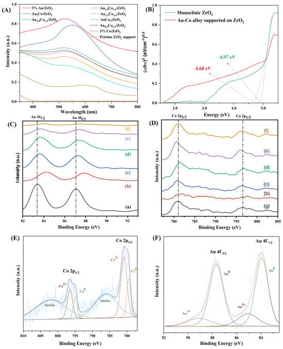 (A) UV–vis spectra of the Au-Co alloy-supported ZrO2 nanoparticles; (B) Tauc plots of the commercial ZrO2 and Au2Co/ZrO2 catalysts used to calculate the optical bandgap; (C,D) high-resolution XPS of the Au 4f states and Co 2p states of catalysts loaded with different amounts of Au-Co: (a) Au/ZrO2, (b) Au2Co/ZrO2, (c) Au1.8Co1.2/ZrO2, (d) Au1.4Co1.6/ZrO2, (e) AuCo2/ZrO2, (f) Au0.5Co2.5/ZrO2, and (g) Co/ZrO2; (E,F) core-level XPS of Co 2p and Au 4f in the Au-Co/ZrO2 catalysts.