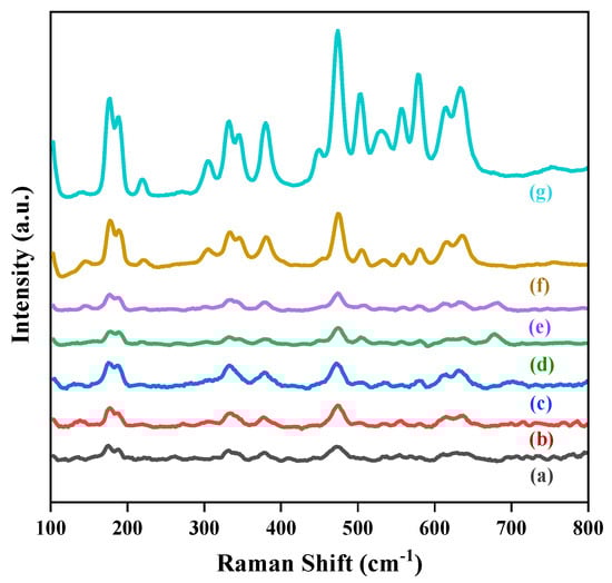 Raman spectra of (a) 3% Au/ZrO2, (b) Au2Co/ZrO2, (c) Au1.8Co1.2/ZrO2, (d) Au1.4Co1.6/ZrO2, (e) AuCo2/ZrO2, (f) Au0.5Co2.5/ZrO2, and (g) 3% Co/ZrO2.