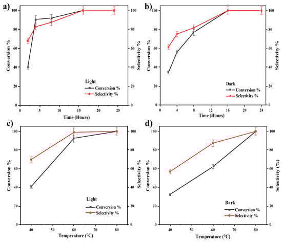 (a,b) The effect of reaction time on the deoxygenation of epoxide reaction with 3% Au/ZrO2 under irradiated conditions and dark conditions. (c,d) The effect of reaction temperature on the deoxygenation of epoxide reaction with 3% Au/ZrO2 under irradiated conditions and dark conditions.