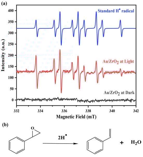 (a) EPR spectra of the reaction medium with the Au/ZrO2 catalyst under light and dark conditions with DMPO and the simulated EPR spectrum for the reference hydrogen radical. (Simulations of the EPR spectra were performed using SpinFit Liquids software—Version 001 by Bruker (Billerica, MA, USA). A Lorentzian line shape with a line width of 0.432633 G was applied. The Gaussian width was 1.09406 G, and the isotropic orientation of the spin system was assumed). (b) A proposed mechanism for the reaction of styrene oxide deoxygenation under light conditions with the Au/ZrO2 catalyst.