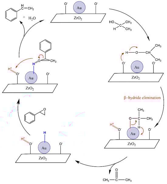Mitsudome et al. and Batra et al. have both reported an ionic mechanism for the deoxygenation reaction within their studies under non-photocatalytic conditions [4,14]. According to this mechanism, the basic sites of the ZrO2 support material in the KOH medium and the Au nanoparticles cooperate in this reaction. Initially, the basic sites of the ZrO2 support can abstract a proton from adsorbed isopropanol, while the Au nanoparticles interact with the alcoholate species. Then β-hydride elimination leads to the formation of Au-H, which is the active species of the medium. This Au-H species can react with the epoxide group to form an intermediate, which dehydrates to generate styrene, thereby completing the catalytic cycle, even without the light radiation (Figure 8).