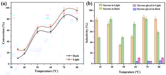 The catalyst of 3 wt% Au-loaded ZrO2 support (3% Au/ZrO2) was first tested for its catalytic activity in epoxide deoxygenation under visible light irradiation for different time and temperature conditions, based on the previously published work by our group [24,45]. As presented in Figure 6, the conversion and selectivity towards the styrene product were higher under light-irradiated conditions than in dark conditions over the range 40–80 °C. Over this range, the exposure of the reaction mixture to light resulted in a higher reaction conversion. As the reaction temperature was increased, the styrene yield also increased in both dark and light conditions, giving a 99% selectivity of styrene at 60 °C in the case of the irradiated reaction mixture and at 80 °C in dark conditions. Therefore, 60 °C was identified as the preferred temperature for the light reaction which yielded the maximum amount of styrene.