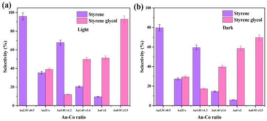 (a,b) The impact of the Au:Co metal ratio in the catalyst for the product selectivity of the deoxygenation of epoxides reaction at 80 °C under light and dark conditions, respectively.