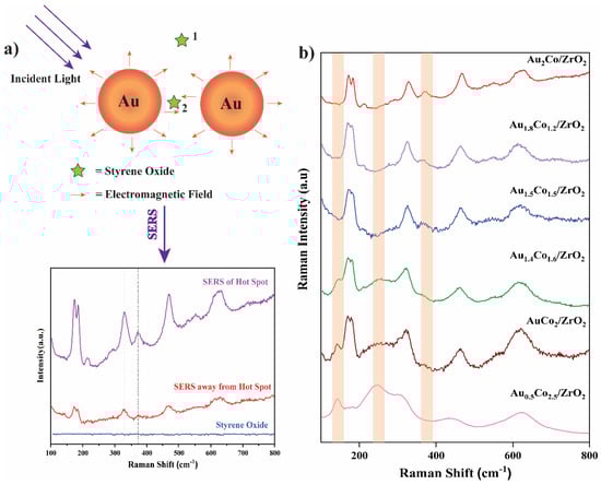 Since the LSPR effect due to gold was so important to achieve substrate conversion, SERS studies were carried out to confirm the existence of hot spots at the catalyst surface and to study any differences in substrate interactions with the addition of cobalt into the Au-Co alloy. Styrene oxide is converted to pure styrene by the Au/ZrO2 catalyst with high selectivity. When Au was alloyed with Co, the reaction path changed, and a new product formed: styrene glycol. Reaction pathway alteration was experimentally tested by the SERS study by analysing the series of catalysts absorbed with styrene oxide molecules under 532 nm of laser with 1800 L/mm grating from the Qontor Raman Spectrometer (Figure 12).