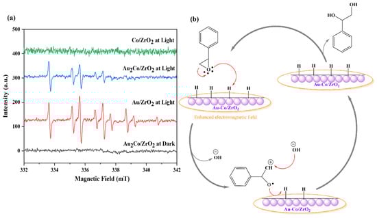 (a) EPR Spectra of DMPO adducts detected in the styrene oxide reduction reaction with the Au/ZrO2, Au2Co/ZrO2, and Co/ZrO2 catalysts under light and dark conditions. (b) The proposed mechanism for styrene glycol formation with the Au-Co/ZrO2 catalyst.