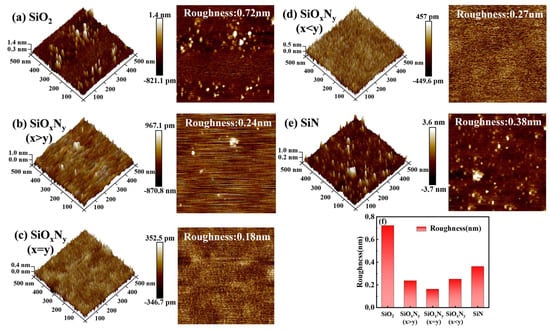 Two-dimensional and three-dimensional morphologies of thin films (a) SiO2, (b) SiOxNy (x > y), (c) SiOxNy (x = y), (d) SiOxNy (x < y), (e) SiN; (f) Surface roughness of the film.