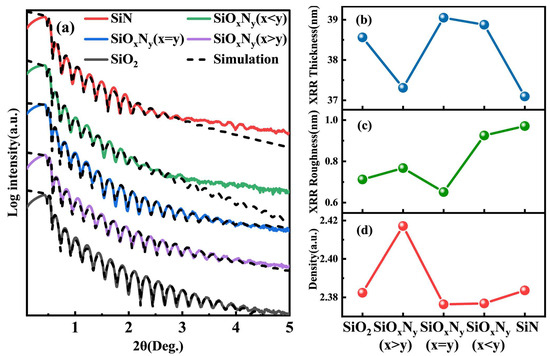 (a) The XRR curves of SiO2, SiN, and SiOxNy films with different N and O ratios were measured and simulated. (b) Thicknesses of different films, (c) RMS roughness, (d) density.