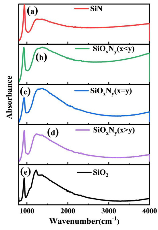 Fourier transform infrared spectra of different films. (a) SiN; (b) SiOxNy (x < y); (c) SiOxNy (x = y); (d) SiOxNy (x > y); (e) SiO2.
