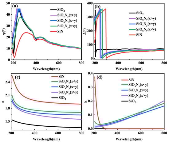 Spectroscopic ellipsometry (SE) analysis in Figure 4a–d delineates the wavelength-dependent optical evolution of Si-O-N films across 200–800 nm. The specific dispersion models chosen for each film (e.g., Cauchy for transparent layers). Systematic enhancement of refractive index (n) with increasing nitrogen content is observed, progressing from n = 1.46 ± 0.02 for SiO2 (632.8 nm) to n > 2.3 for SiN at equivalent wavelength, demonstrating precise optical tunability through O/N stoichiometric control. The stoichiometric progression reveals intermediate n-values: 1.78 ± 0.03 (SiOxNγ, x > y), 1.92 ± 0.02 (x = y), and 2.15 ± 0.04 (x < y), conforming to Bruggeman effective medium approximations with <3% deviation from theoretical predictions [27]. This trend arises from nitrogen-induced densification (2.1 → 3.2 g/cm3) and enhanced polarizability due to Si-N bond electronegativity (χ = 3.04) surpassing Si-O (χ = 3.44).